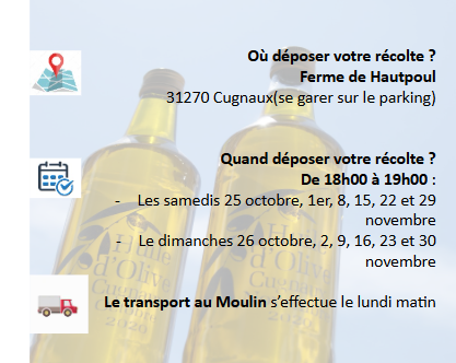 Les points de collecte sur nos lieux de récolte (au plus près de vous), le calendrier vous sera communiqué dès que possible.