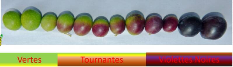 Pour l'olive c'est quand elle commence à passer du vert au noir en passant par le prune, c'est à ce moment là que les olives peuvent commencer à être ramassées, la moitié de l'arbre doit au moins commencer à tourner.